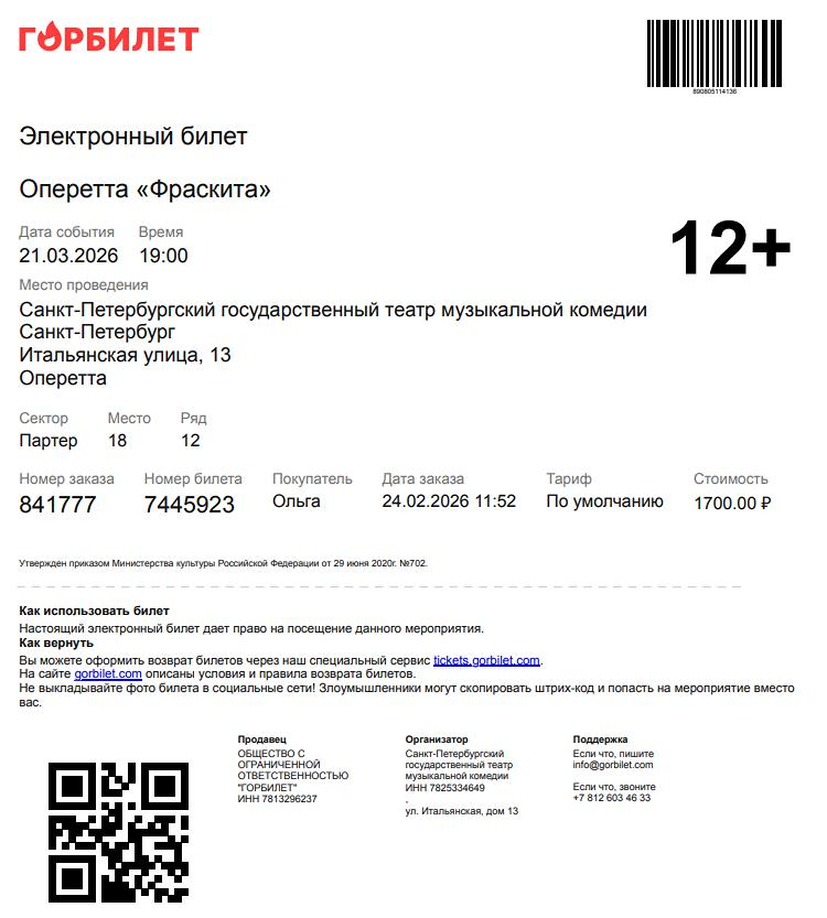 Электронный билет, купленный на официальном сайте театра, на котором представлена информация о мероприятии, будет содержать номер места, стоимость заказа, штрих-код.